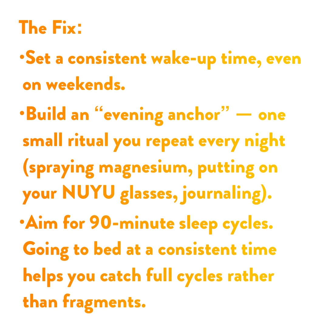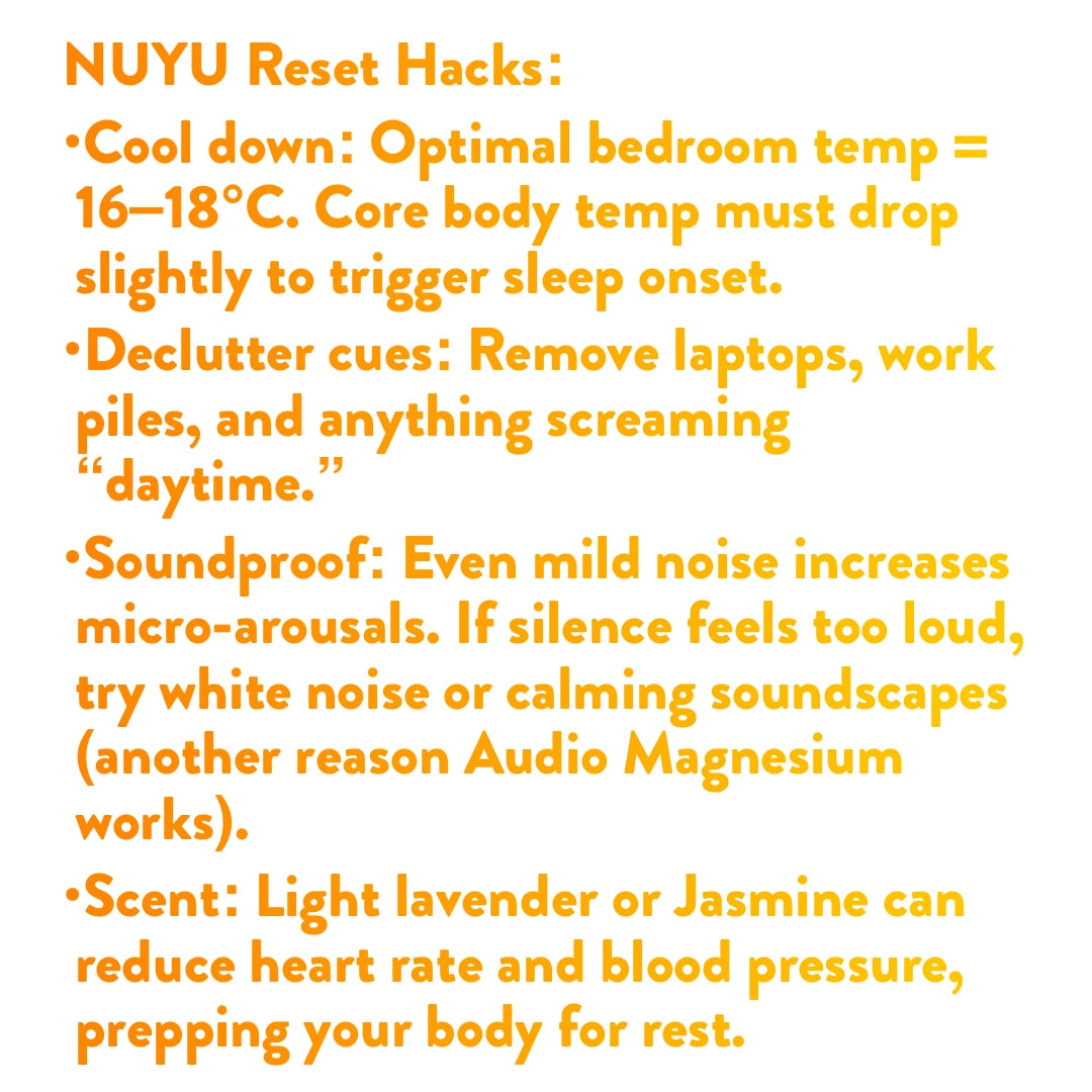 At NUYU, we believe in rituals that actually work. Spray magnesium. Play a guided reset. Slip on your glasses. Journal for 5 minutes. None of it is complicated. All of it works with your body, not against it.