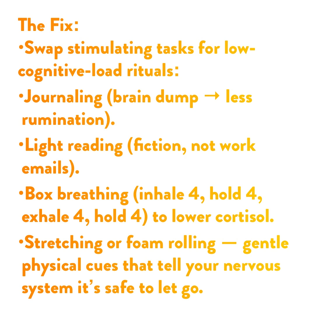 Your brain isn’t just light-sensitive, it’s input-sensitive. The last thing you do before bed sets the tone for the night. News feeds? Doomscrolling? That keeps your prefrontal cortex over-engaged. Stress hormones (like cortisol) spike, making melatonin’s job harder.